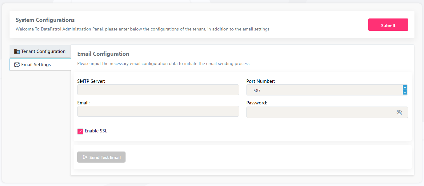 Email Settings (opcional): esta aba possibilita configurar os paramêtros do servidor SMTP responsável por enviar e-mails de alertas e notificações para os usuários do painel de controle do DataPatrol.