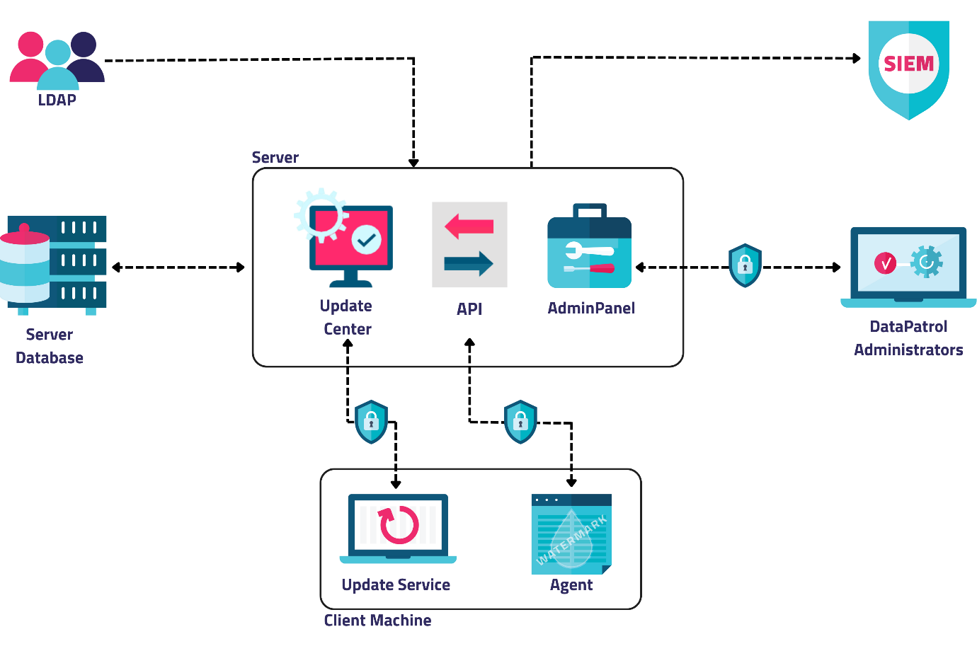 O DataPatrol é baseado em uma arquitetura cliente-servidor que roda 100% na infraestrutura da empresa (on-premises). O servidor do DataPatrol é responsável por rodar e prover os serviços de API e Update Center, que se comunicarão via rede com a máquina do cliente onde o agente estará instalado.