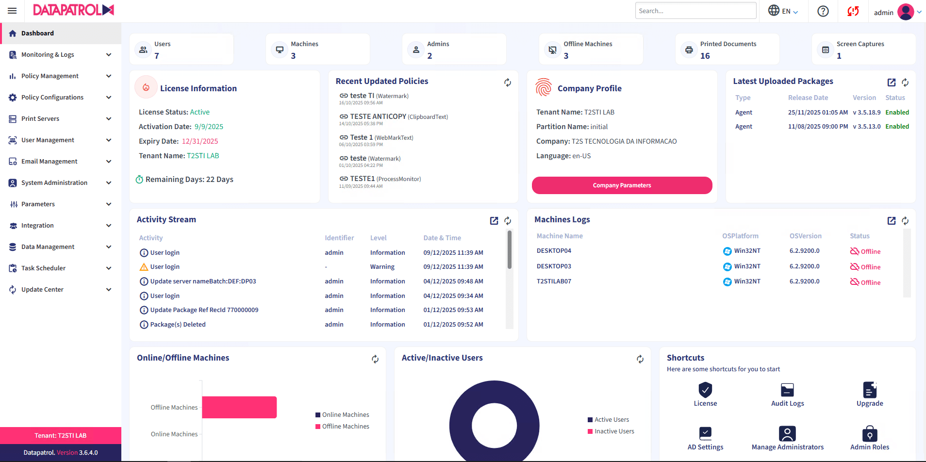 O DataPatrol fornece uma interface administrativa central (navegador web). Esse dashboard avançado possibilita à equipe de cibersegurança da empresa monitorar em tempo real o funcionamento dos agentes, as marcas d’água nos computadores, as tentativas de print screen ou cópias não autorizadas de textos., entre outras funcionalidades. Essa visualização em alto nível se torna um importante componente no monitoramento em tempo real de padrões de tentativas de exfiltração de dados.